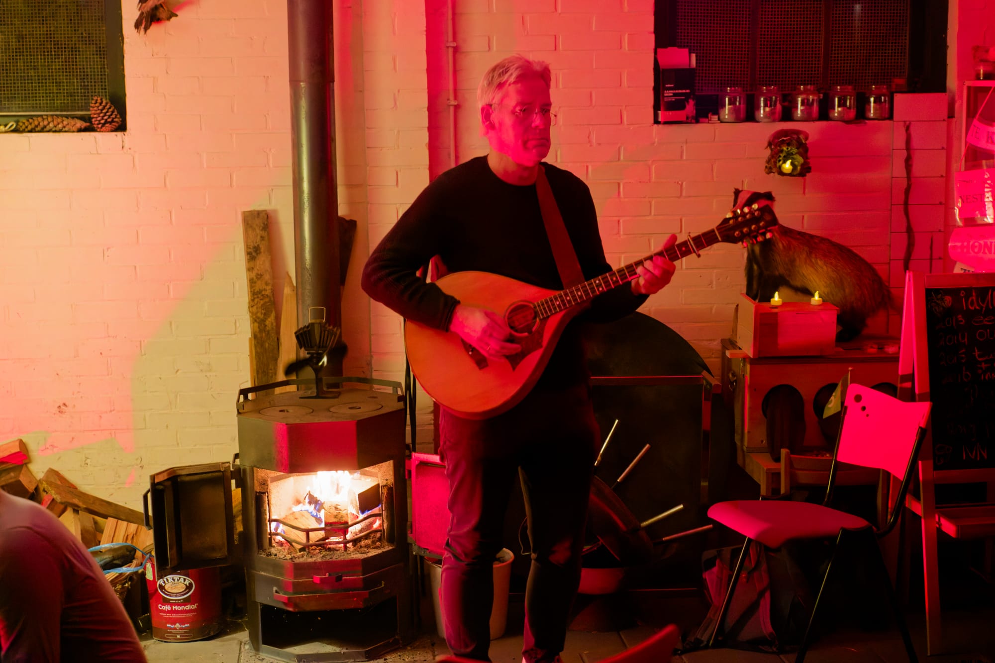 Fleur deelde versgeschreven poëzie én zong. Kwetsbaar, puur, zacht. Jan pingelde mee.