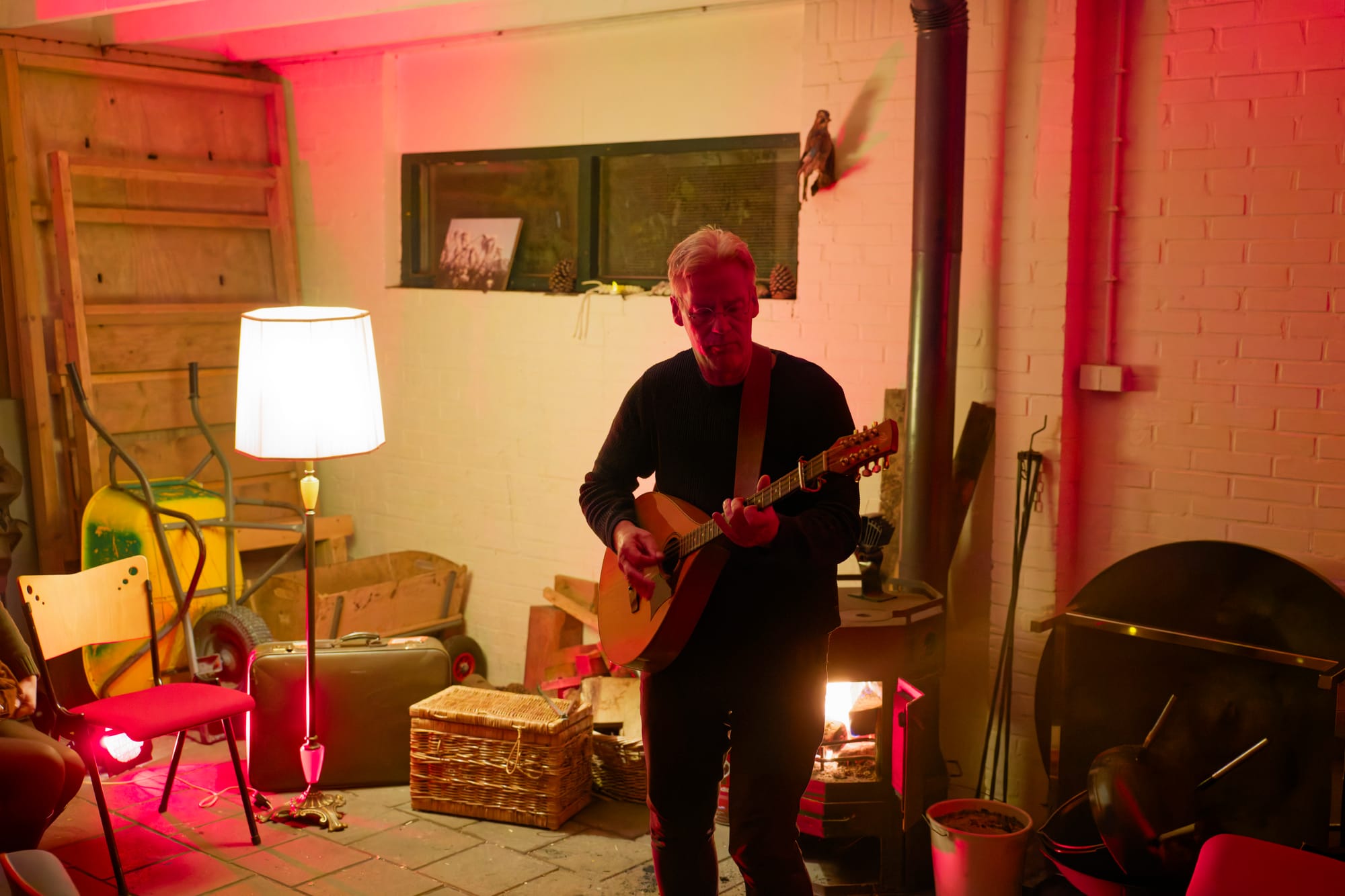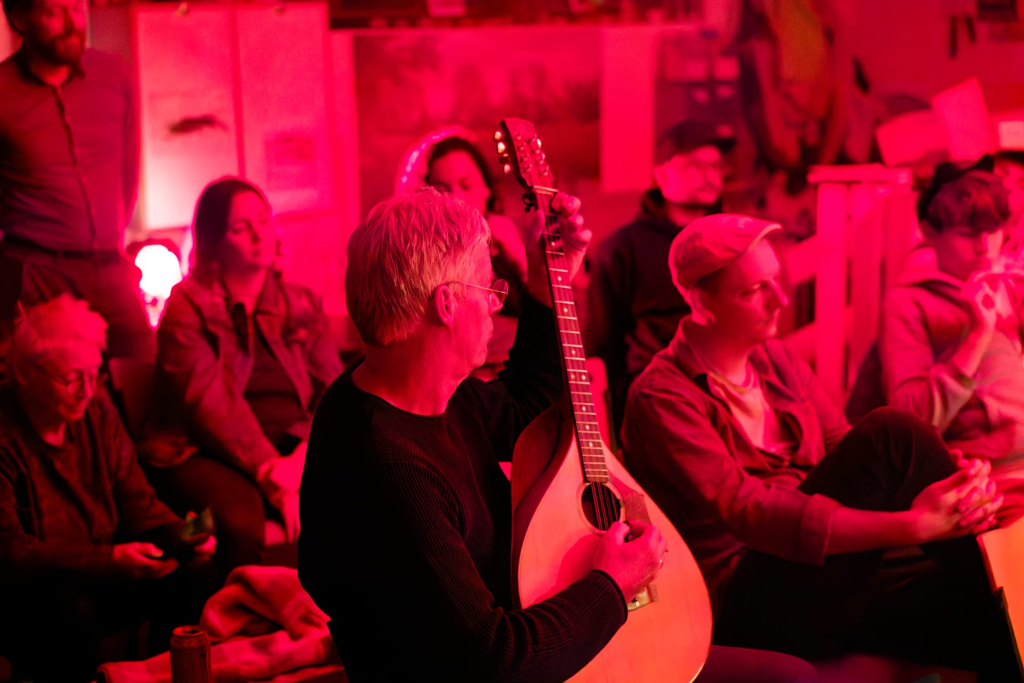 Jan pakte zijn gitaar, liep langzaam naar voren, en ving de aandacht van de groep met zijn gitaarspel.