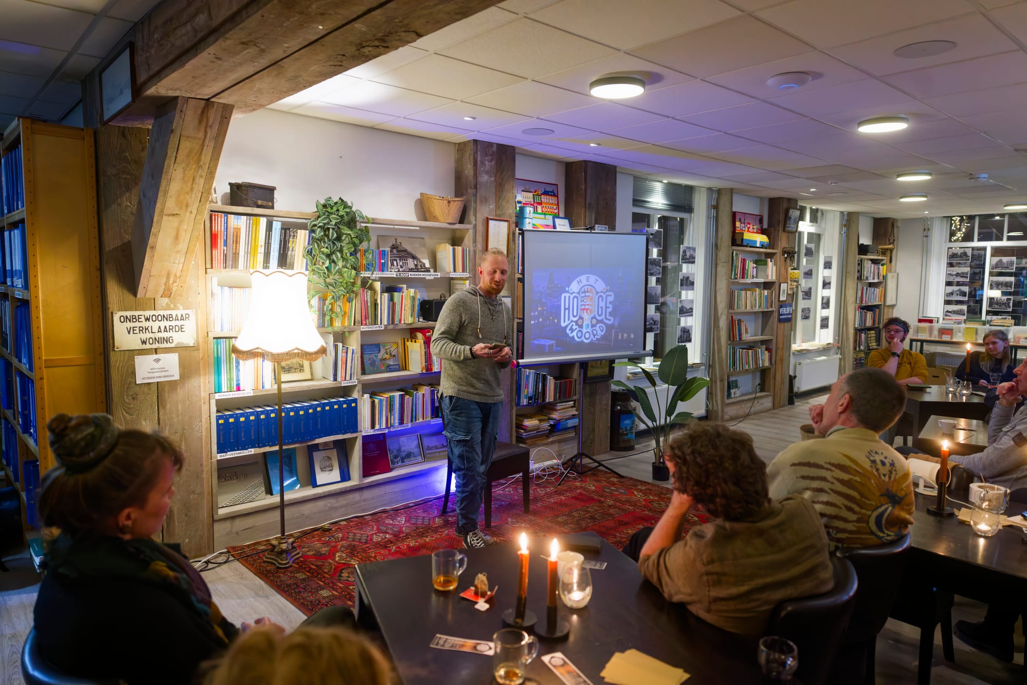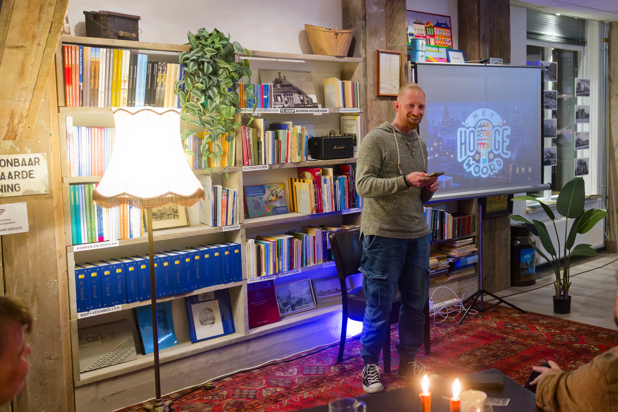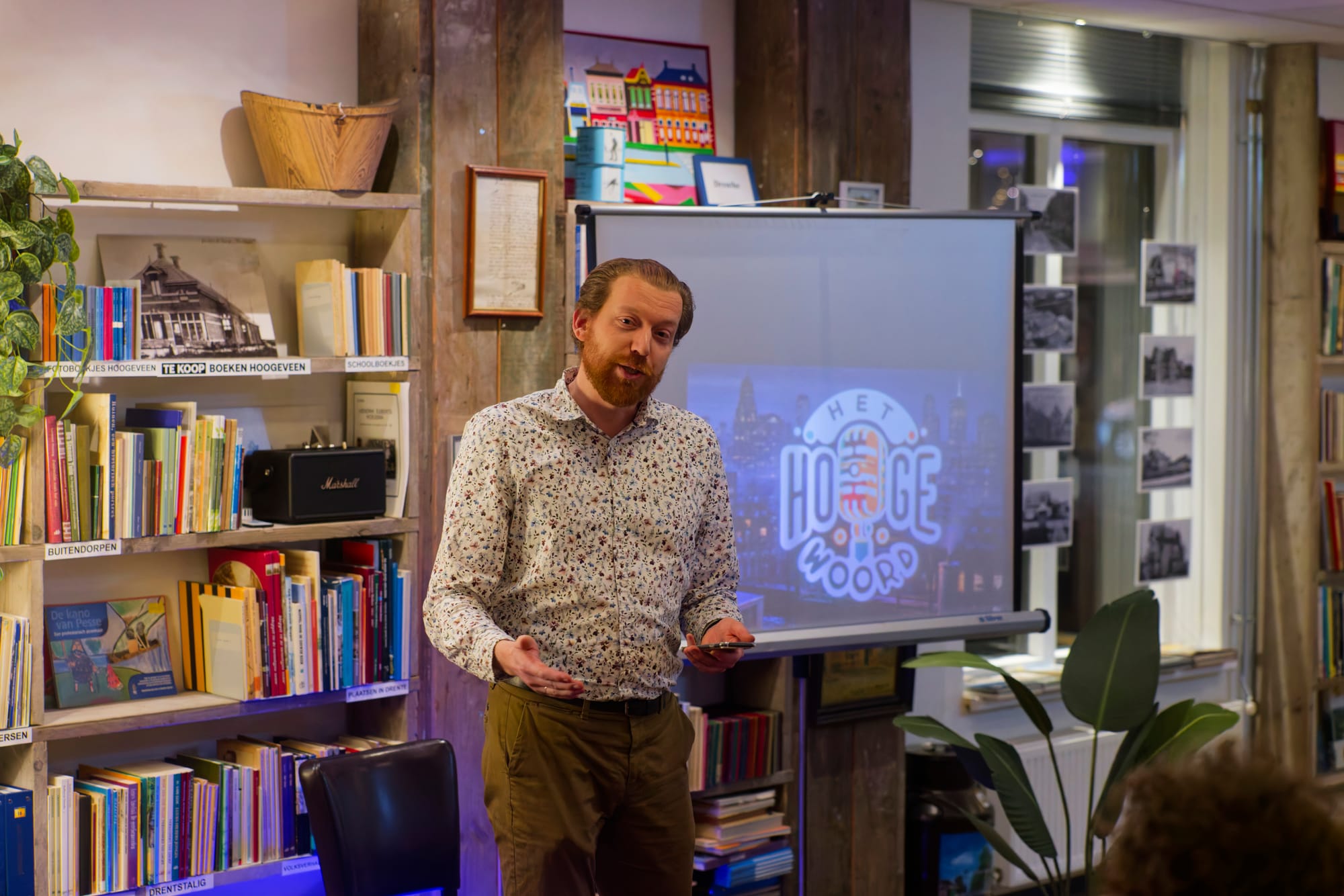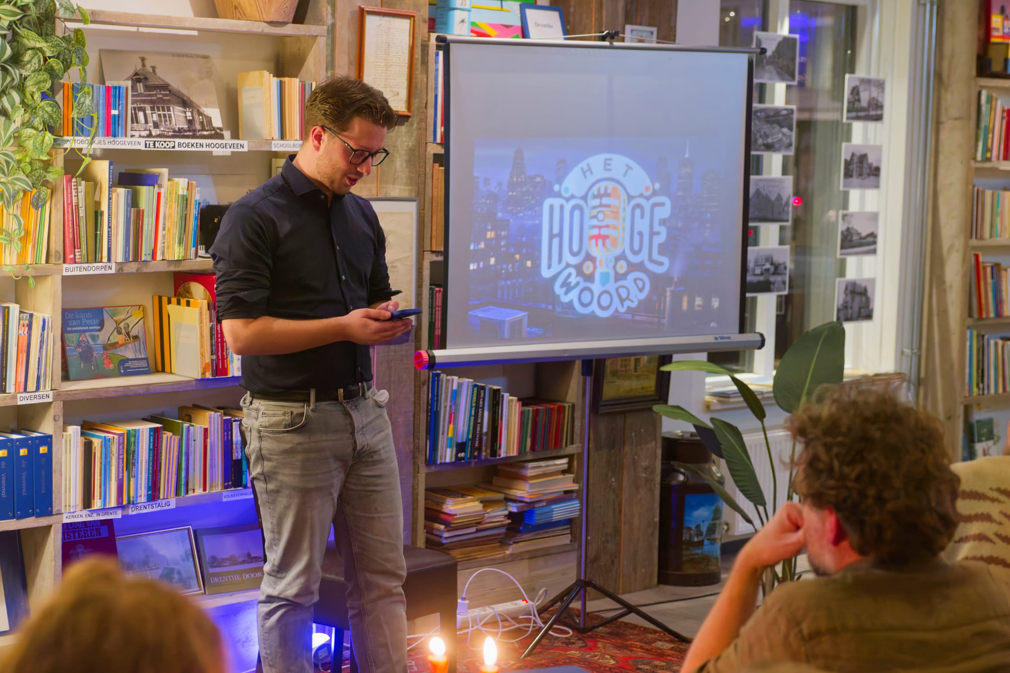 Nieuw dit keer? Een beamer én een scherm — want Tim had iets bijzonders voor ons voorbereid. Het beeldmerk van Het Hooge Woord stond te stralen.